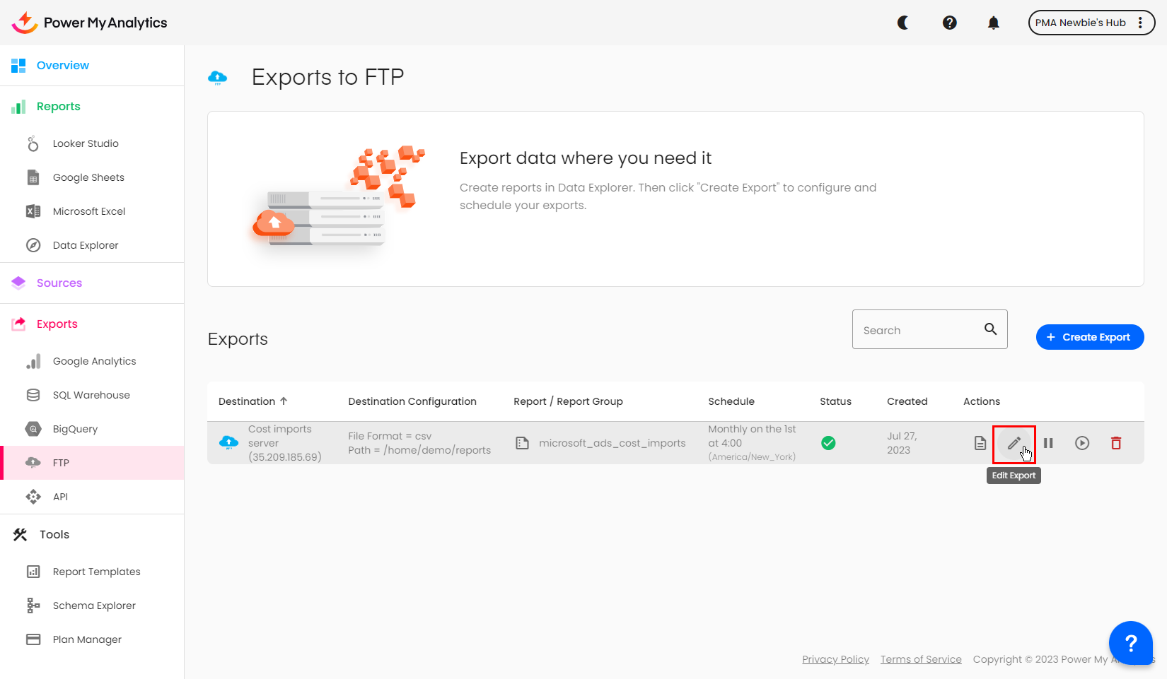 Click on FTP under Exports. Find your export in the Exports table and click the pencil icon to edit the settings.