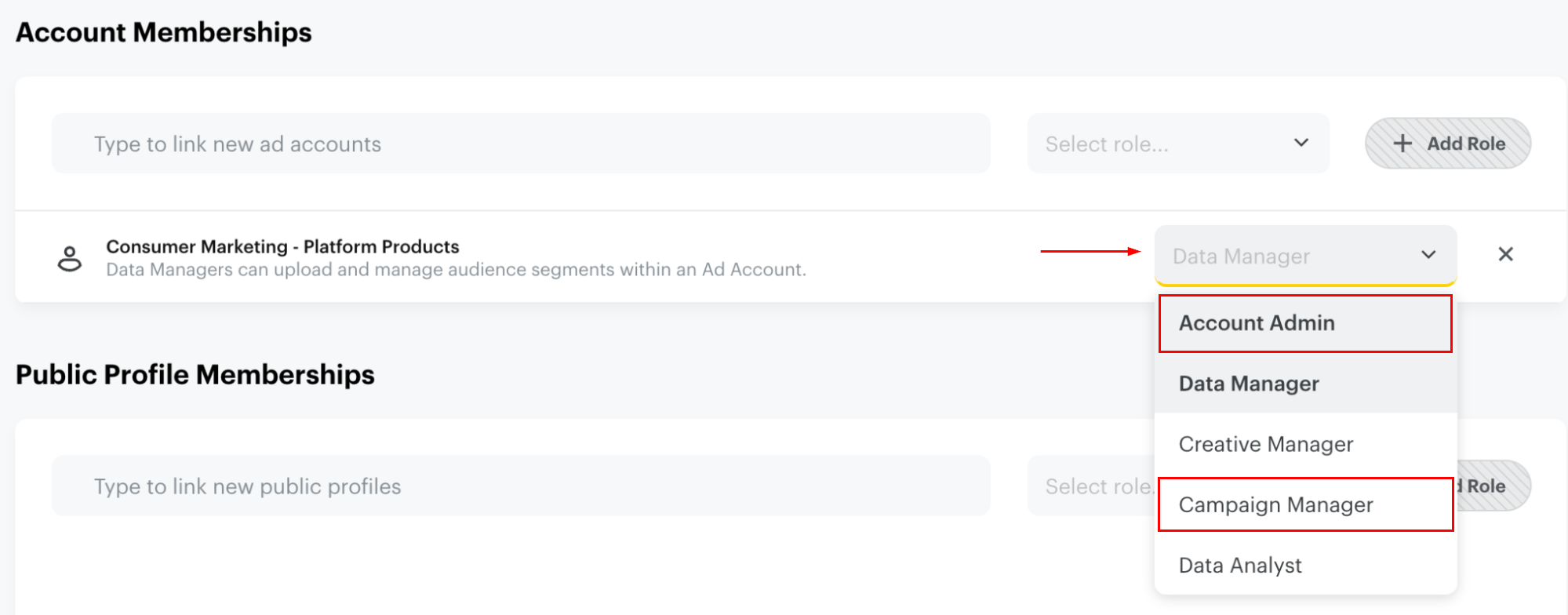 - Select the account, then choose an ad account role of Account Admin or Campaign Manager.