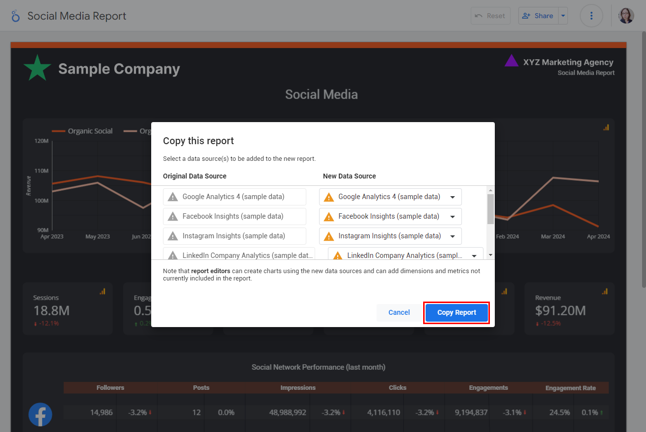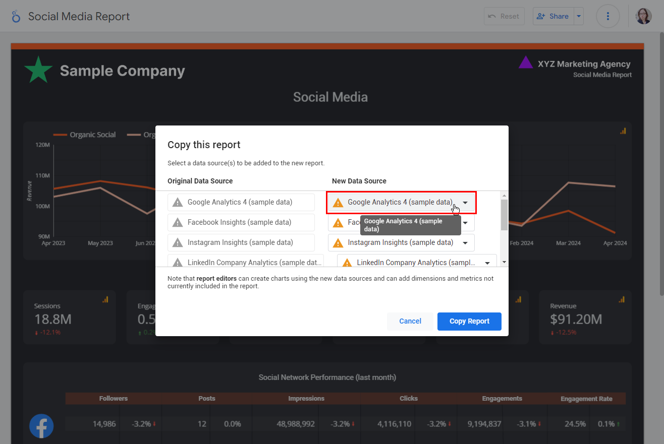 Next, add your data sources for Google Analytics 4, Facebook Insights, Instagram Insights, LinkedIn Company Analytics, Twitter Analytics, YouTube Analytics, and Pinterest Lifetime Analytics. You can also leave these set to sample data to create a report using PMA's randomly generated example data.