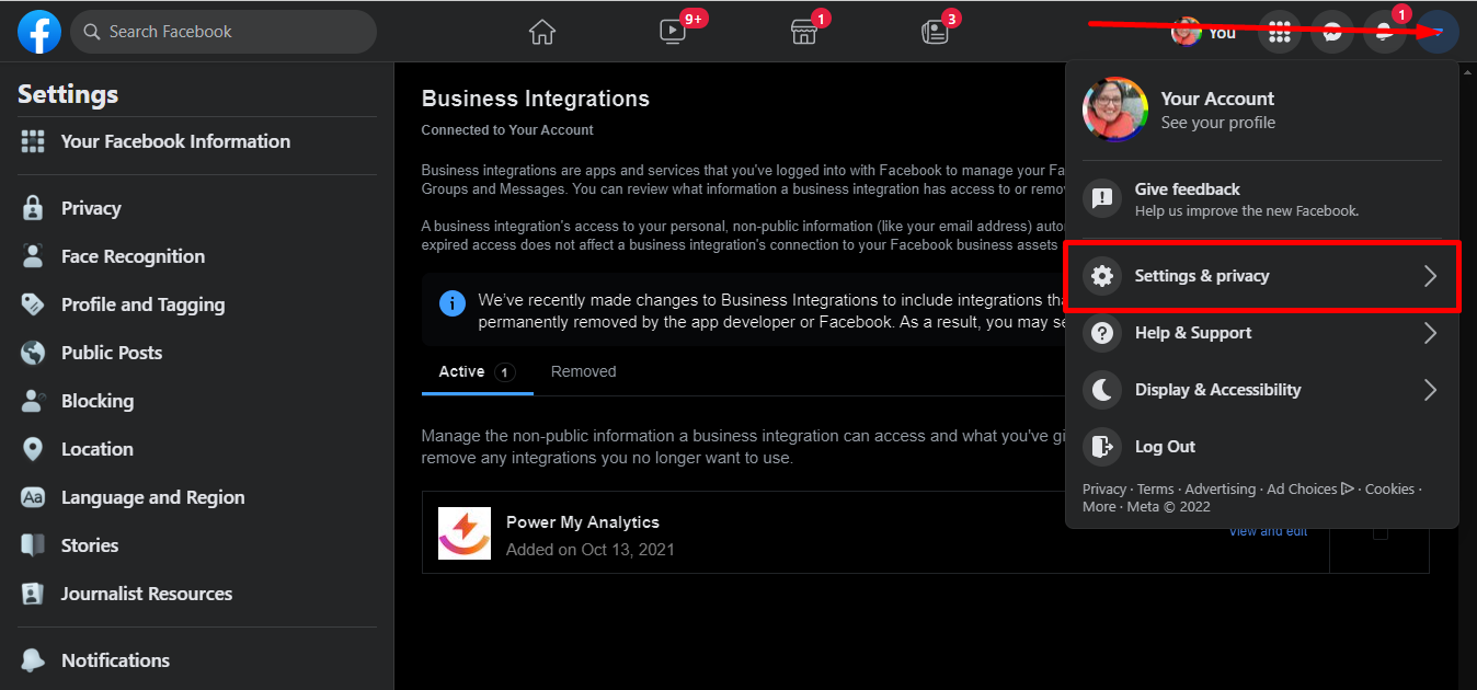 If the above link does not work, click the drop down menu next to your image at the top right corner of your Facebook Homepage. Click Settings & Privacy.