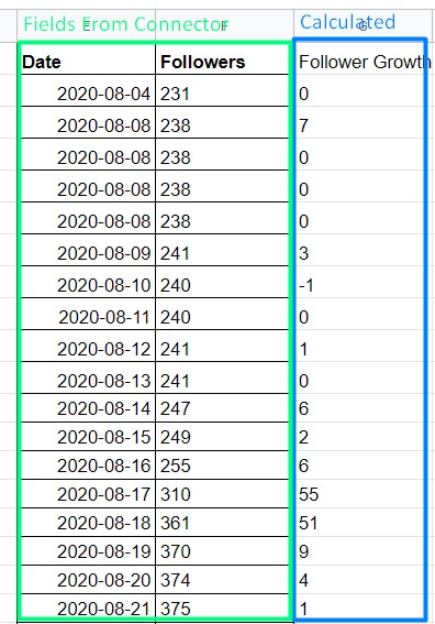 - Looker Studio does not have the ability report the delta change in a metric between two date ranges by itself. You can report the total value and change from last time period or same time period last year only. Google Sheets allows for this calculation to be assembled. Take Instagram Follower Growth, for example. Report the date and Followers fields, then calculate Follower Growth:
