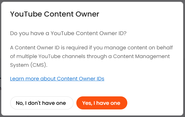 - If you have a Content Owner ID: Click "Yes, I have one" to proceed to the next step.